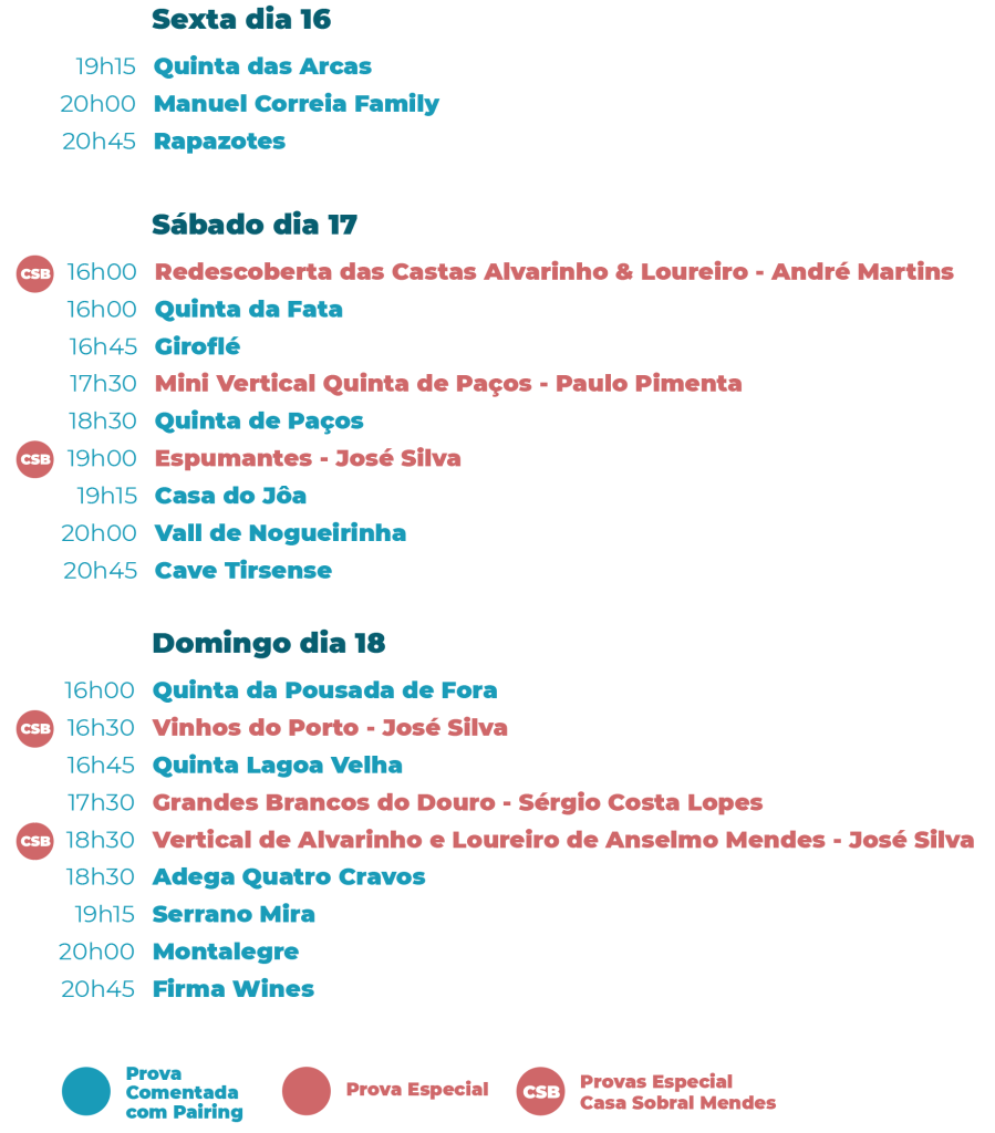Cada um dos produtores presentes irá apresentar os seus vinhos com pairings preparados pelo Chef Álvaro Costa, em sessões de aprox. 35 minutos no espaço de provas.